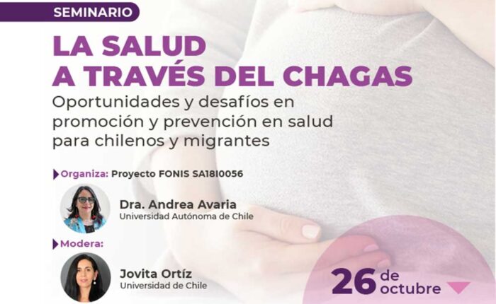 El equipo del proyecto FONIS SA18I0056, a cargo de la Dra. Andrea Avaria les  invita a participar del seminario: “La salud a través del Chagas. Oportunidades y desafíos en promoción y prevención en salud para chilenos y migrantes”.